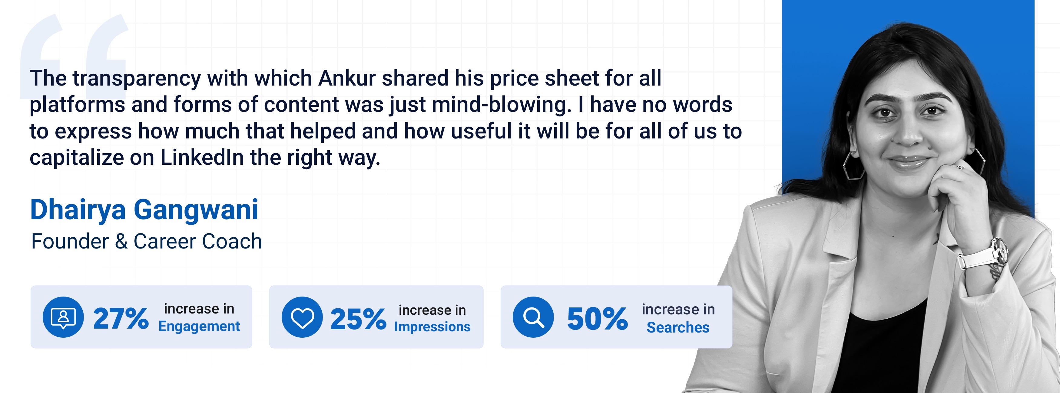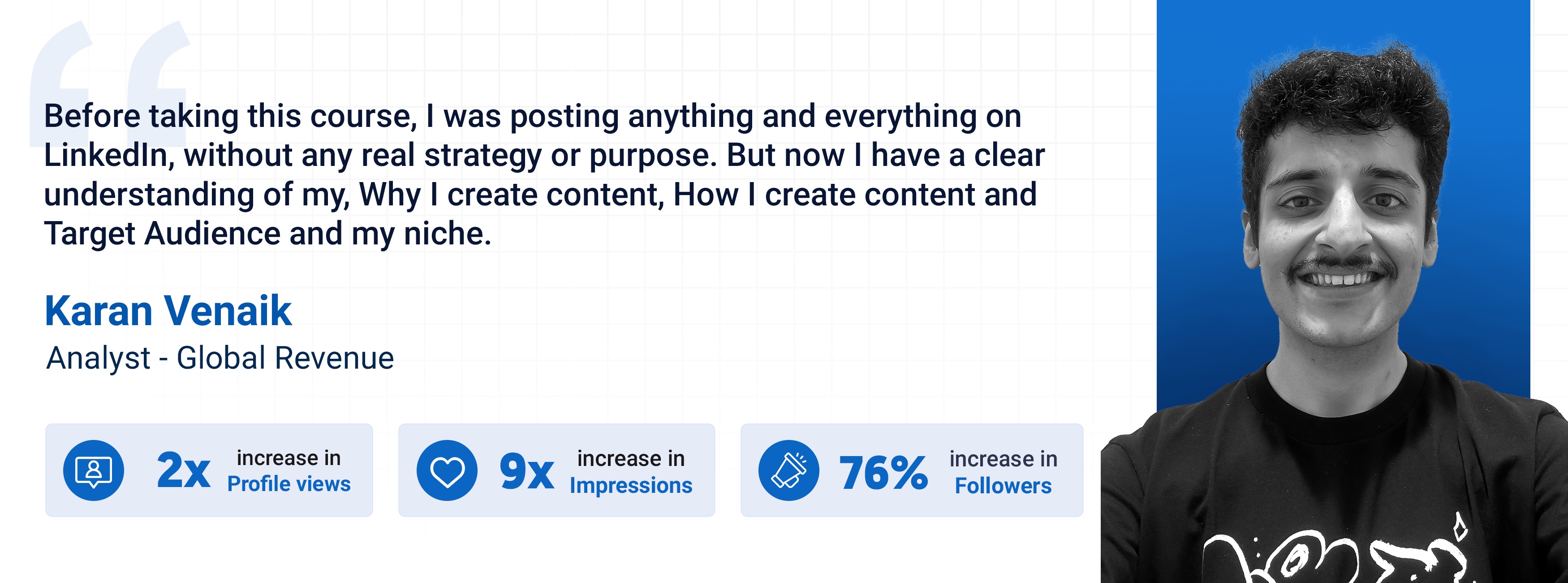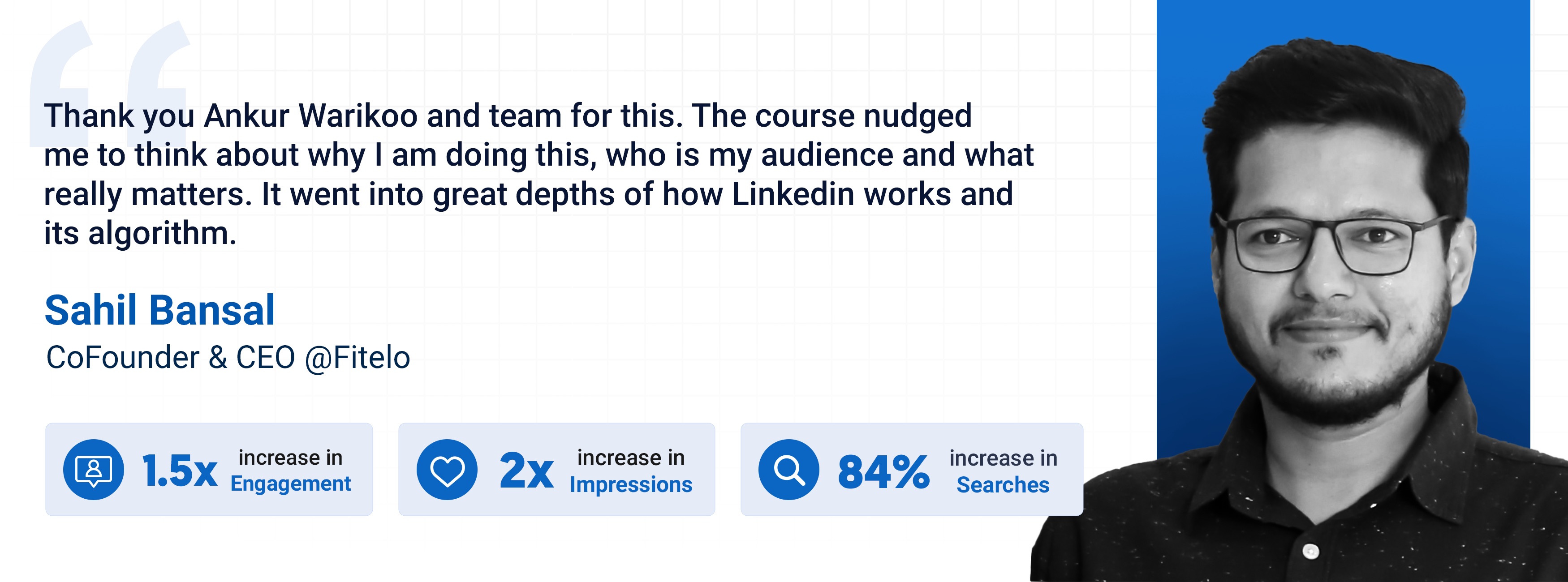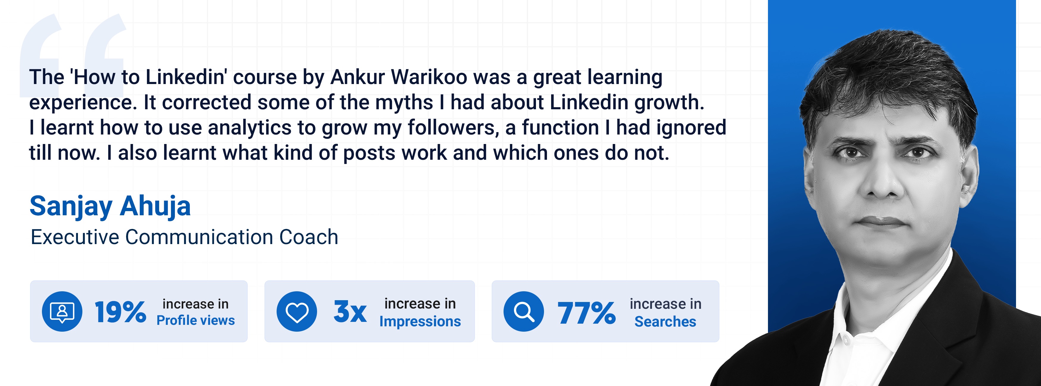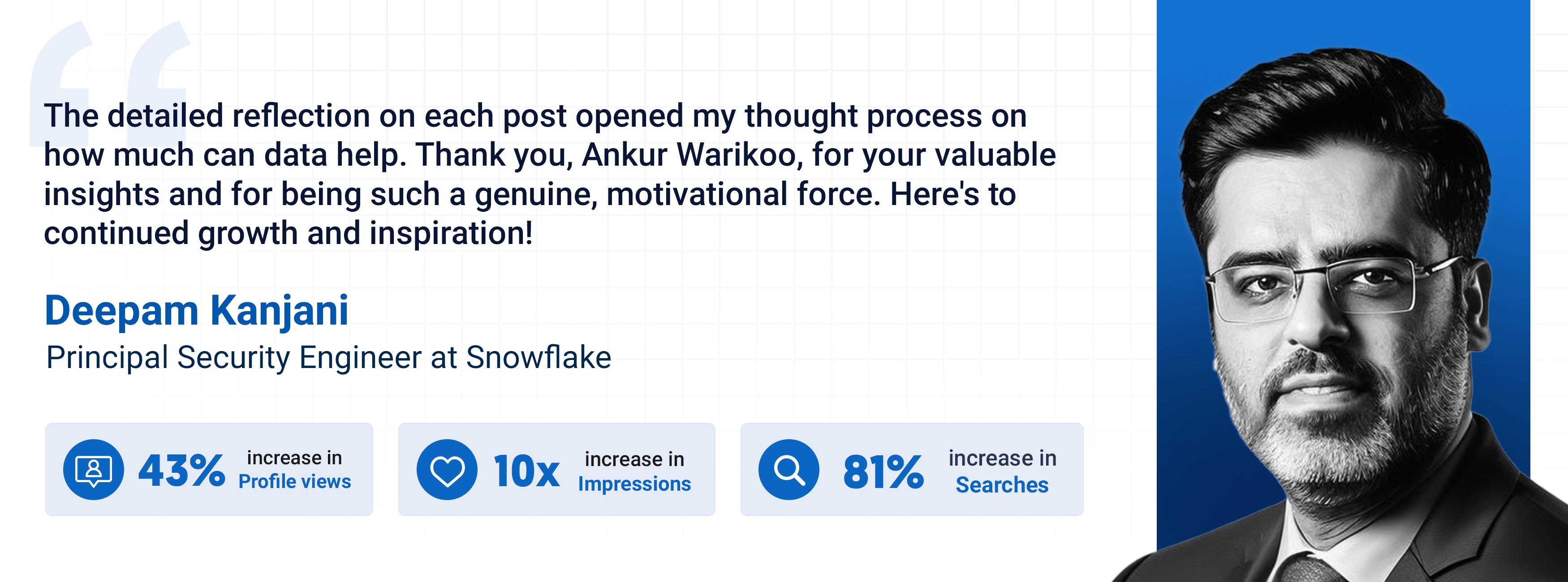 Ankur has been creating content on LinkedIn for the past 10 years. He started in 2013 with zero followers. Today, with 2.2M+ followers on LinkedIn, he is consistently ranked as one of the top profiles globally. He is also part of LinkedIn’s Top Voice program — an invitation-only group of experts across the professional world.